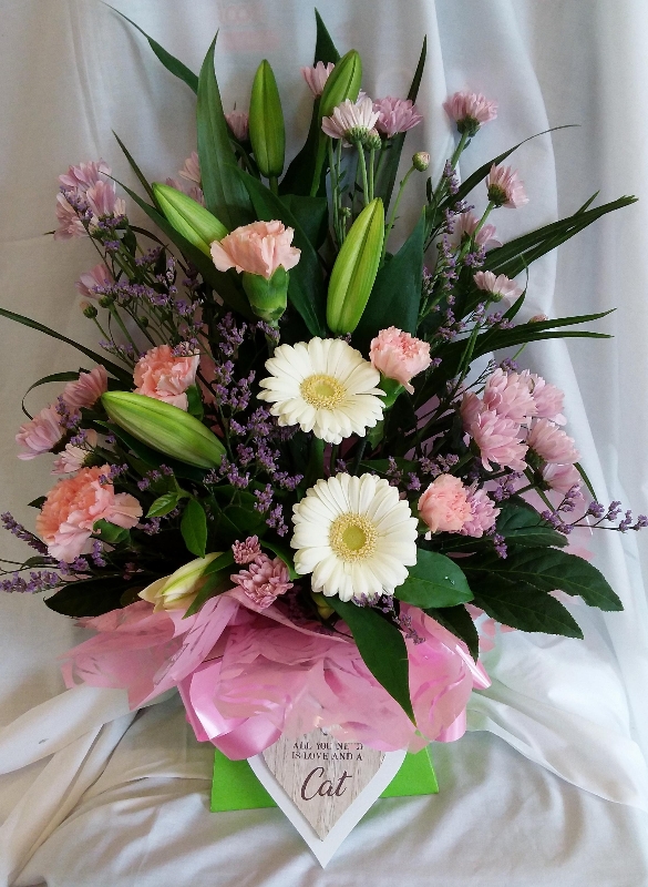 Welcome to our keepsake boxed hand tieds. Each boxed hand tied is individually designed using the freshest of flowers and the colours can be personalised to your tastes by choosing from the menu on each product. The box and bow colour are colour matched to your flower colour choice, and to each bow a keepsake is attached. The keepsakes are made from wood with a natural finish and printed with a loving annotation. A fabric ribbon is attached allowing your loved one to remove it from the bow for use within their home.