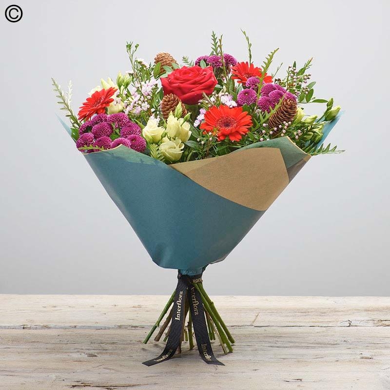 Take the hassle out of choosing a gift, and let us design something special for you. Our Christmas Florist Choice Hand tied - no lilies is designed using the freshest flowers and foliage of the season with the expert knowledge and experience of our florists (but of course no lilies!). You can leave the choice of colours to us or just let us know if there is anything specific that you would like. The hand tied is tied in a water bubble, gift wrapped in Christmas inspired cellophane (or craft paper, please let us know your preference) with a bow in a colour coordinating scheme, and a Christmas pick; delivered in bud for longevity.