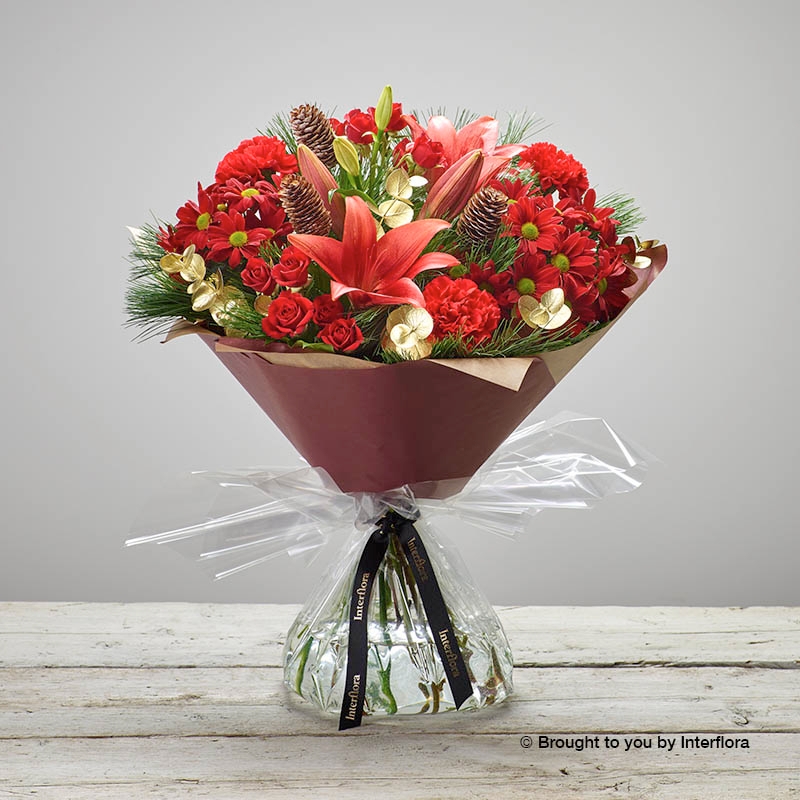 Take the hassle out of choosing a gift, and let us design something special for you. Our Christmas Florist Choice Bouquet is designed using the freshest flowers and foliage of the season with the expert knowledge and experience of our florists. You can leave the choice of colours to us or just let us know if there is anything specific that you would like. The bouquet is gift wrapped in Christmas inspired cellophane with a bow in a colour coordinating scheme, and delivered in bud for longevity.