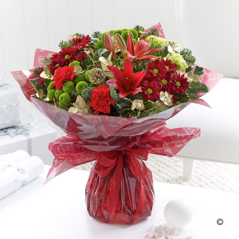 Take the hassle out of choosing a gift, and let us design something special for you. Our Christmas Florist Choice Handtied Gift Set is designed using the freshest flowers and foliage of the season with the expert knowledge and experience of our florists. You can leave the choice of colours to us or just let us know if there is anything specific that you would like. The bouquet is gift wrapped in Christmas inspired cellophane with a bow in a colour coordinating scheme, and a Christmas pick; delivered in bud for longevity, with a balloon and a 200g box of Cocoa Dusted Truffles with Salted Caramel Flavour.