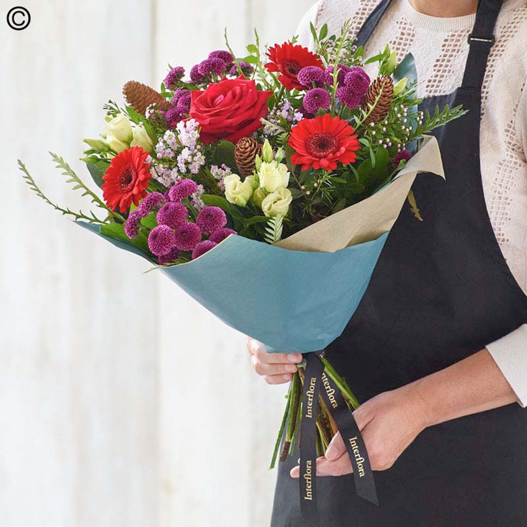 Take the hassle out of choosing a gift, and let us design something special for you. Our Christmas Florist Choice No Lily Hand tied is designed using the freshest flowers and foliage of the season with the expert knowledge and experience of our florists. You can leave the choice of colours to us or just let us know if there is anything specific that you would like, but of course with not a lily in sight! Each and every design is one-of-a-kind, created using the freshest stems available on the day. The hand tied is tied in a water bubble, gift wrapped in Christmas inspired cellophane or craft paper (please let us know if you have a preference) with a bow in a colour coordinating scheme; delivered in bud for longevity with a 99g box Classic Chocolate Collection.