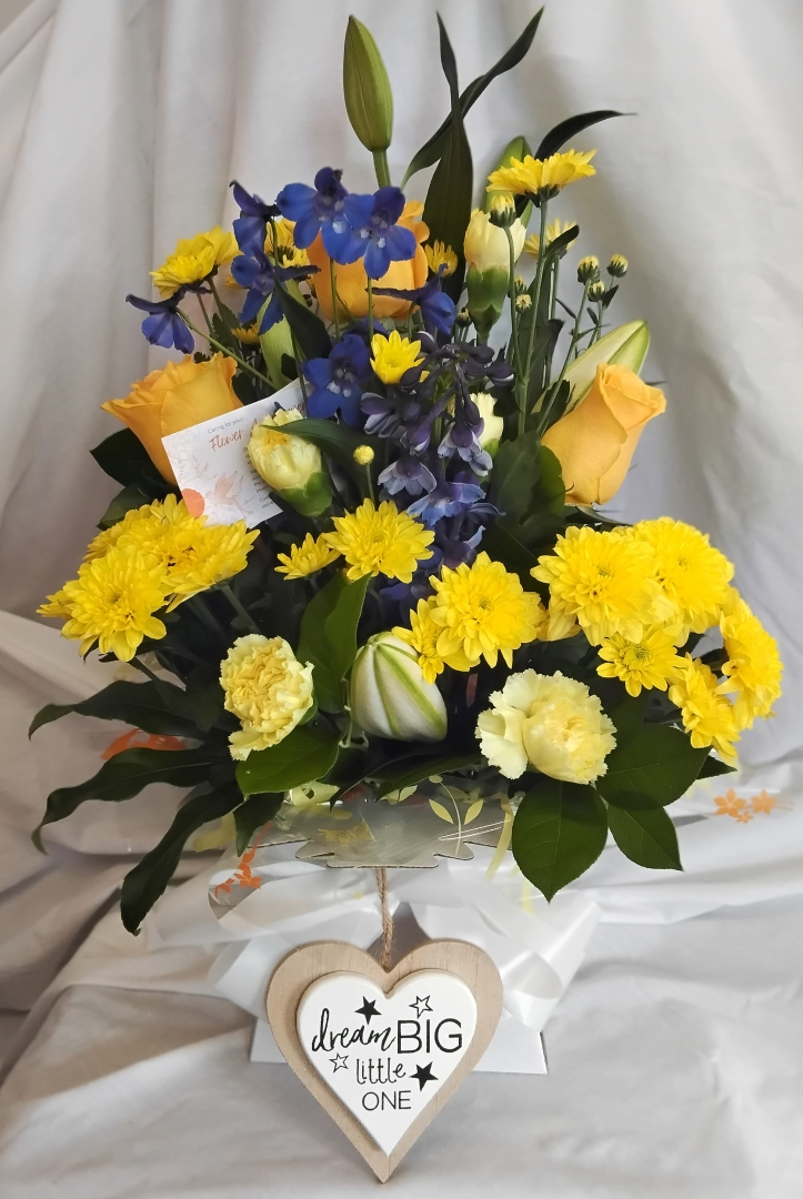 Take the hassle out of choosing a gift, and let us design something special for you. Our Dream Big Little One Keepsake Box Display is designed using the freshest flowers and foliage of the season with the expert knowledge and experience of our florists. For longevity, the flowers will be delivered in bud and arranged in floral foam for easy care. You can leave the choice of colours to us or just let us know if there is anything specific that you would like. The colours of the box, bow and gift wrapping will be all colour coordinated to match your choice of flower colour.