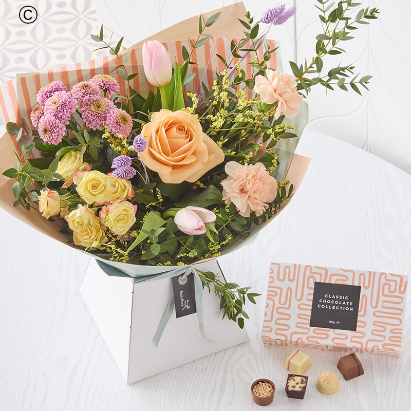 Each and every trending design is one-of-a-kind using the soft shades of the season; peach, lemon, lavender and orange to pink and green. Or maybe all of the above! For a different "pop", dried/painted flowers or foliage are included. Gorgeous blooms carefully arranged in a loose spiral which balances colour and texture, beautifully wrapped in our eco-friendly kraft paper and delivered in bud for longevity with a 99g box of mixed chocolates.